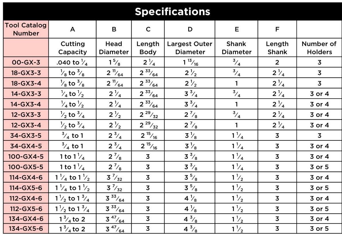 Tools have ¼” range of adjustability from .040″ to 2″ diameters.